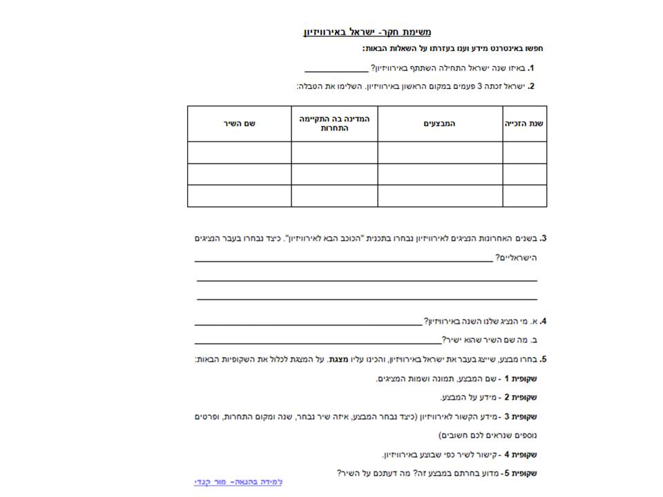 בהמשך, התלמידים יתנסו במשימת חקר- יחפשו מידע באינטרנט על ישראל באירוויזיון, יענו על שאלות ויכינו מצגת על מבצע שייצג בעבר את ישראל (עפ”י הוראות). אצלי בכיתה הם יבצעו את המשימה בזוגות. אך אפשר גם ביחידים או אפילו בקבוצות.