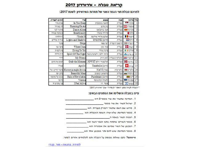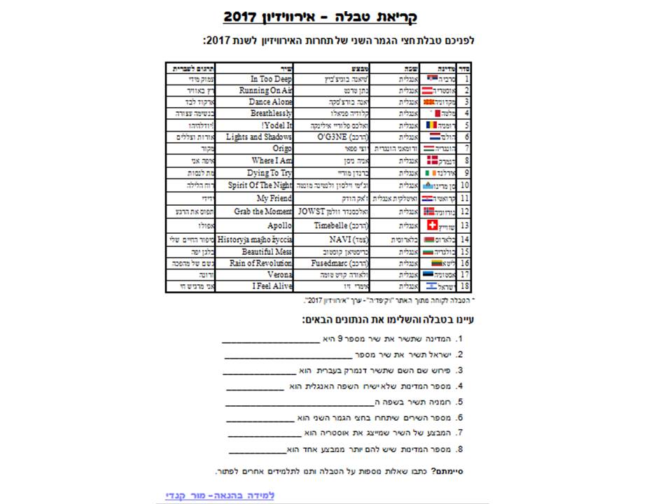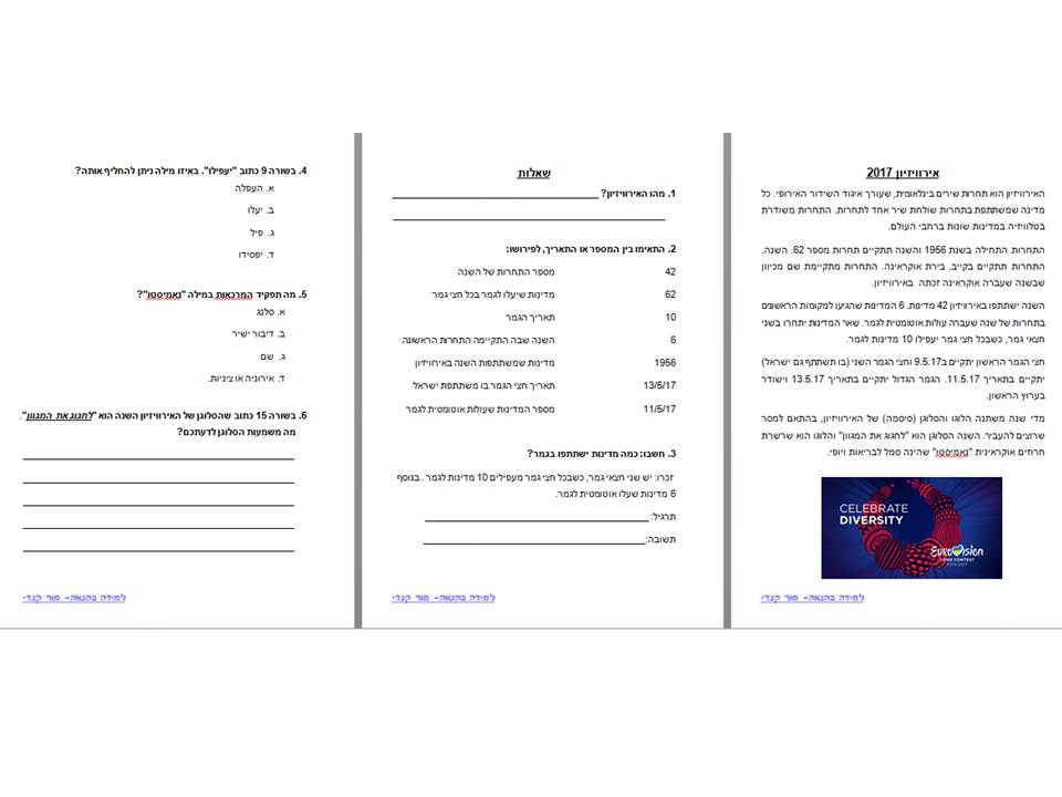 נתחיל בטקסט מידעי על האירוויזיון, עם שאלות המותאמות לנושאים שלמדנו בכיתה בהבנת הנקרא:
