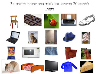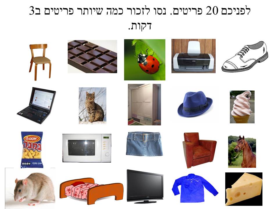 אתמול בשיעור הראיתי לתלמידים מסך עם 20 תמונות עליו. עליהם היה לזכור כמה שיותר פריטים תוך 3 דקות