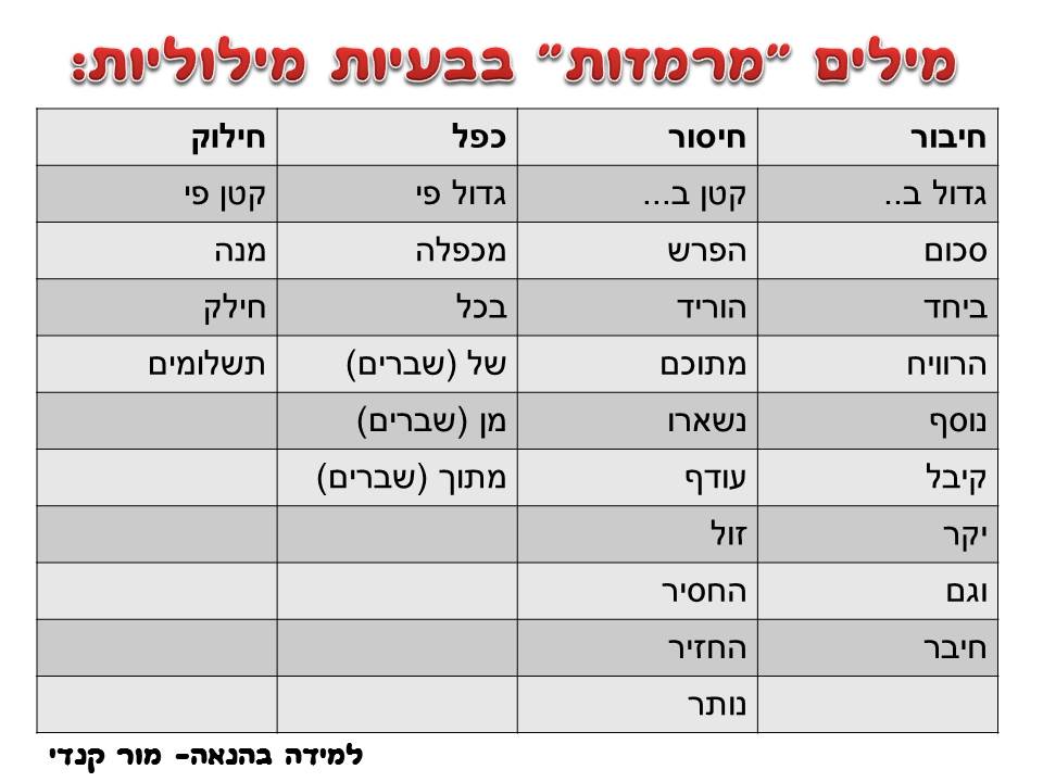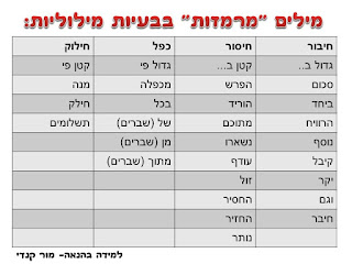 הערה- כמובן שלא כל המילים נכונות במאה אחוז מהמקרים. תמיד יש יוצאים מהכלל (למשל בבעיות של גיל), אבל בחינוך המיוחד אנחנו נותנים להם בעיקר את בעיות פשוטות מהחיים. אני חושבת שעדיף ללמד את יוצאי הדופן ושהם יצליחו ב95% מהמקרים. חשוב גם לדבר עם התלמידים על כך שתמיד אפשר לנסח את השאלה בצורה הפוכה ולתת להם דוגמאות לשאלות הפוכות.