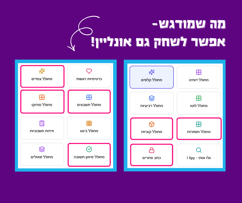 המשחקים מתאימים לעבודה בגן, בכיתה, בטיפול, ולעבודה פרטנית.
